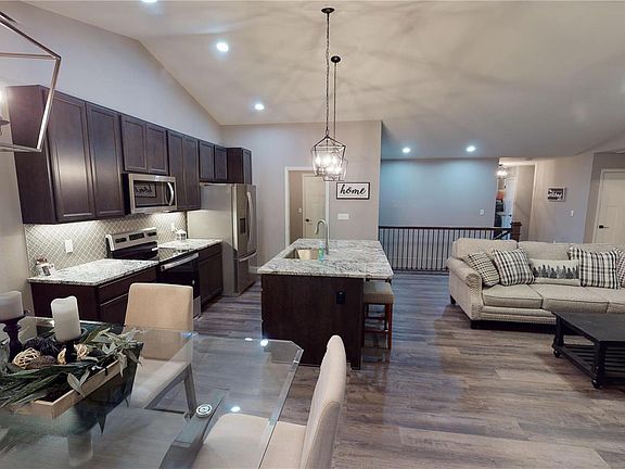 Home features, 3 car garage, extended front porch, black columns on back patio, stone front sill high, 5 interior can lights, pantry cabinet, waterline for icemaker, 42" cabinets in kitchen, under cabinet lighting, cathedral ceilings in great room, kitchen and breakfast room, pocket door at master bath, open staircase with spindles, craftsman newel post, level door knobs, rain glass in master bath window, color walls throughout, deluxe master bath with tile shower, tile around tub, double bowl master bath, adult height vanity & toilet, upgraded plumbing fixtures, upgraded shower door, 4 window bay in master, glass in garage door, 2 garage door openers, rough in bath in basement, color soffit, fascia & gutters, 12x12 covered patio, shaker siding in gables in front, shadow boards, upgraded front door, vertical siding in front, backsplash in kitchen, upgraded flooring, granite in kitchen, upgraded carpet and much more!!