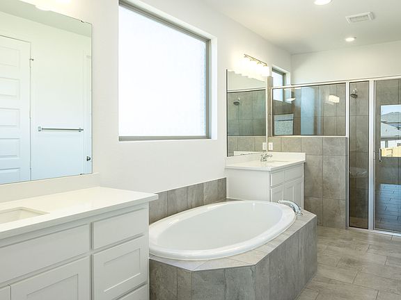Front porch opens into a two-story entryway with a grand staircase. French doors enclose the private home office. The utility room is conveniently located off the main hallway. The family room boasts extended ceilings and a wall of windows. The kitchen has an island with built-in seating, 5-burner gas cooktop and a walk-in pantry. The dining area is embraced by a corner wall of windows and allows entrance into the extended covered backyard patio. The primary bedroom boasts three large windows. French doors open into the primary bathroom which hosts dual vanities, a garden tub, glass enclosed shower, and two walk-in closets. Upstairs you are welcomed by a game room and secondary bedrooms. Completing the home is a guest suite tucked beyond the mud room which features a full bathroom. Two-car garage. Representative Images. Features and specifications may vary by community.