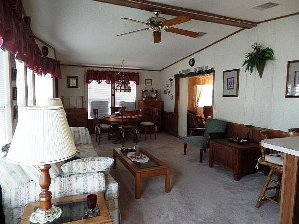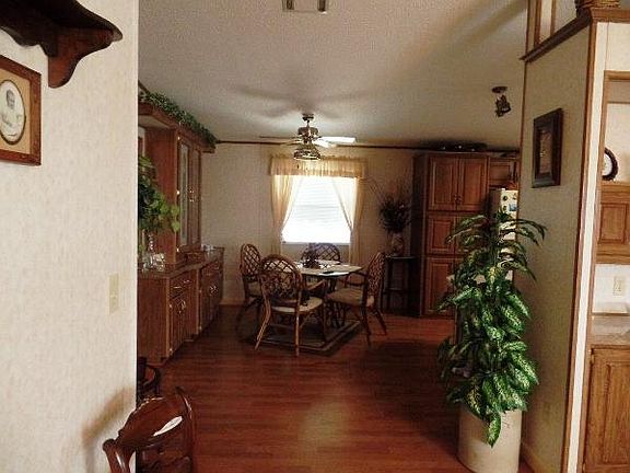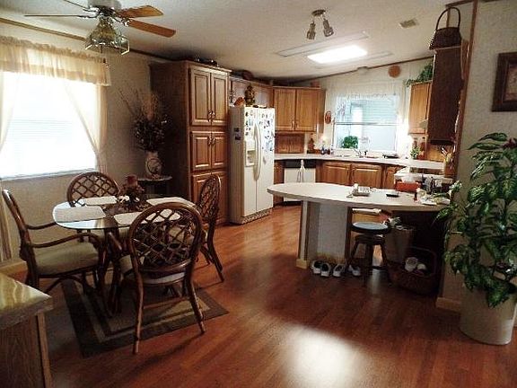 If you are looking for a home of your dreams, this could be the one. Owner takes great pride in her home, and she was the original owner when the home was placed in this community. She added a new roof and new central heat and air in 2014. She also had new vapor barrier and screening under the house replaced. Her plumbing has completely been re-done. You will enter into a front Florida room that is part of the manufacturing. It is centrally cooled and heated and has windows completely across the front for maximum natural lighting. It also has new carpet. One one end you have a very cool bar area with a bar sink, stools and counter. this opens right into the kitchen through a big window for great serving and entertainment. You will enter the living room area through sliders into a spacious living and dining area. This also has new carpeting. It has a huge wall unit for storage, television, and collectibles. It has wood cabinets and the counter tops are marbleized laminate with the look of granite. Off the living area is a dining room with built in buffet and opens into galley kitchen with a breakfast bar. Great wood cabinet space and includes very sought after appliances garages on each side of counters to store small appliances. Her refrigerator is also is double door with ice maker and water and ice in the door. She added a new glass top range and it has a dishwasher and garbage disposal. Great working area for the cook. The flooring for the kitchen, dining room and hallway features new laminate that compliments the color of all the cabinets and buffet. The hallway is extra wide and opens to hallway full bath and laundry room and both bedrooms. The guest bedroom features a walk in closet. Wait till you see the master suite. It is huge and has an over-sized walk in closet for all of your clothes and accessories. It also has a small closet near the bathroom for additional storage. The master bath is large with double sinks and a great mirrored area to sit and do your make-up and toiletries. Nice corner shower with great shower head. The toilet is newer and has soft cushion. Off the fully equipped laundry room with cabinets, and a desk area where you could put your computer or use as a small home office. It opens to a raised Florida Screen room with roll down storm awnings. It features ceramic tile flooring and opens to the backyard that has a great large cement patio. The shed is also very roomy for extra storage such as lawn furniture, golf clubs and tools. You will love this location. Owner will also consider furniture negotiable. Call for a viewing of this beautiful home today. *information is deemed accurate, but not guaranteed*