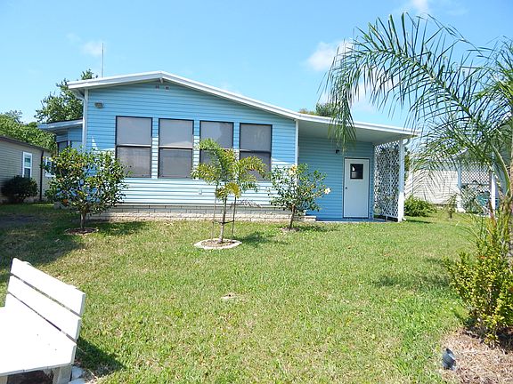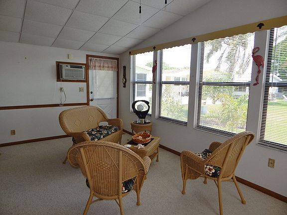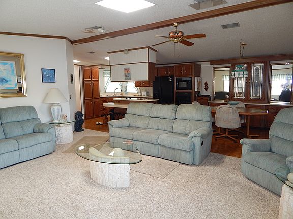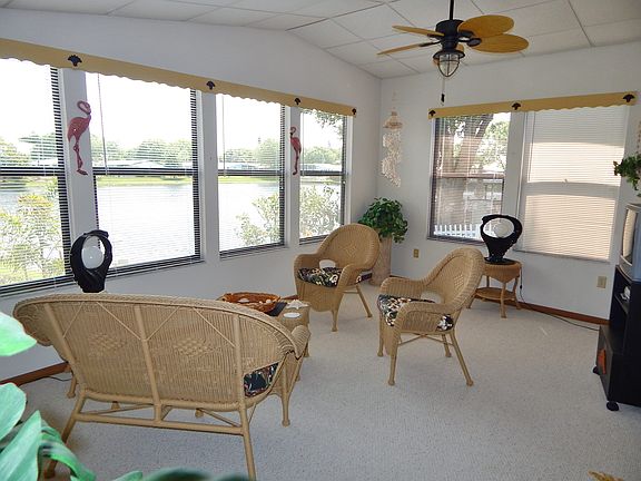 Nice big waterfront beauty complete with garage and workshop! This 1565 sq.ft home is open and bright and well furnished. The owners put a new roof and 4 new skylights in 2011. The center island kitchen is the most sought after plan in Paradise Island. There are 2 large bedrooms and 2 great baths. The master suite stretches the whole length of the back of the home with French doors opening to the master bath with garden tub and a walk-in shower and cabinets for all the storage you could need. There is an inside laundry room conveniently located next to the bedrooms. The Florida room is off of the kitchen and the view of the pond is so calming from the dining room and Florida room or sit on the back deck and lawn to watch the resident lady swan glide around her waterfront home with a center lighted fountain. Just last fall these owners added a new energy efficient a/c unit. You will love all of the amenities here at this 55+ community, it truly is a 4-star park. With it's wide streets and sidewalks it's more like a subdivision and you can bring you dog, this park is pet friendly. Call Eileen to see this home.