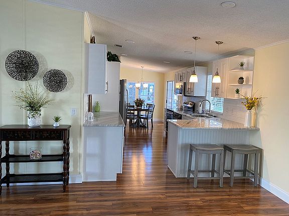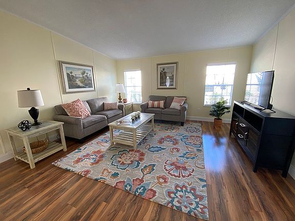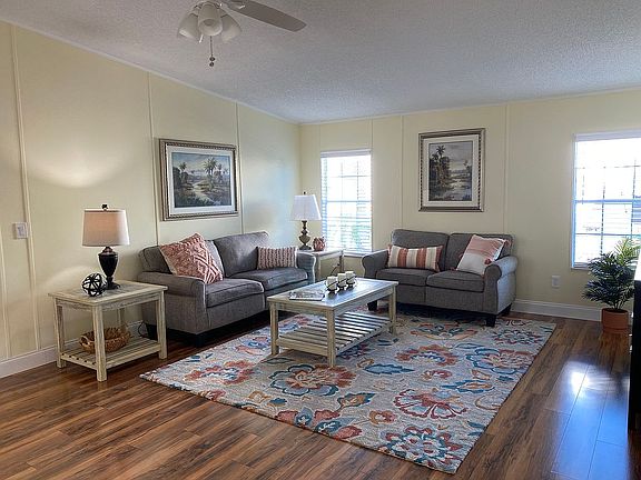 Professionally renovated and furnished 3/2 home in Paradise Island with full lot share. Enjoy all Florida has to offer in this 55+ community close to beaches, shopping and fishing. New roof 2015. New AC. New real wood cabinets and custom granite tops in kitchen and baths. New master bath with custom tile/glass shower and tile floors. New waterproof wood floors and fresh paint throughout. Home has a model home feel. HOA fee includes trash pick up twice weekly, unlimited water and sewer, and Comcast cable and wi-fi. A must see.