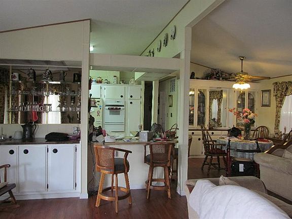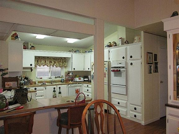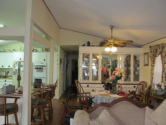 Spacious 2 bd, 2 ba with wet bar, living and dinning room, kitchen with wooden counter top. Baths with shower grab bars. Covered patio and parking. Laundry area inside. AC, hot water heater, microwave, windows about 5 yrs old per seller. New energy efficient refrigerator per seller. Gated community has beautiful clubhouse, pool, spa and green area and RV storage.