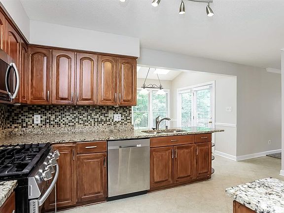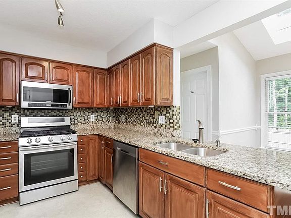 This Apex two-story corner home offers granite kitchen countertops, stainless steel appliances, and a deck.