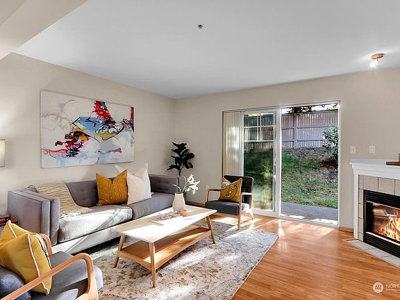 Explore this cozy condominium on the first floor in a secure gated community! This unit boasts 2 bedrooms, 1.75 baths, and 912 sq ft of open-concept living, creating a spacious ambiance. Transition into this move-in-ready abode, freshly painted and ready for your personal touch. The dining area flows seamlessly into a cozy living space with a gas fireplace and a private patio, perfect for relaxing or entertaining. Retreat to the primary bedroom featuring an en-suite bathroom. Enjoy the central location, with easy access to shopping, schools, dining, Boeing, I-5, and a golf course just a few blocks away. Benefit from a one-car carport and a designated parking space. The HOA includes water, sewer, garbage, and common area maintenance.