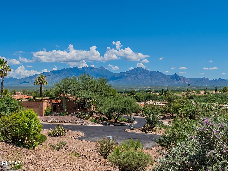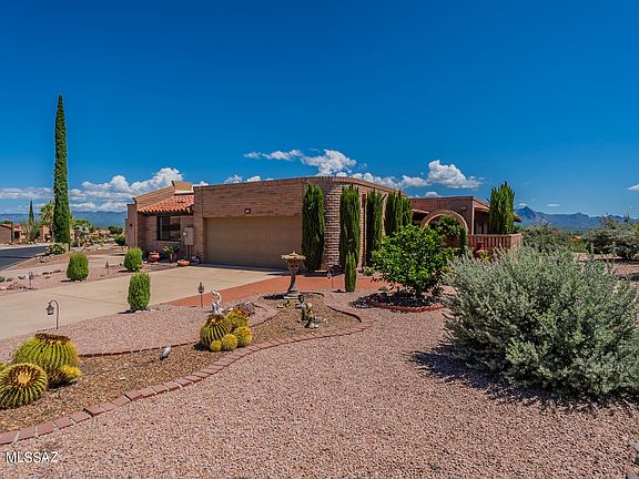Experience Southwest living at its finest in this captivating two-bedroom, two-bath home, showcasing the most coveted mountain views in Green Valley. Set on an elevated lot, this 2,238-square-foot residence offers breathtaking panoramic views of the Santa Rita Mountains. From the moment you arrive, the corner lot location and striking curb appeal will capture your heart. The versatile floor plan seamlessly integrates a spacious living room and formal dining area, both thoughtfully designed to maximize the awe-inspiring mountain views. These spaces provide the perfect setting for entertaining guests or enjoying a quiet retreat. The expanded kitchen features custom cabinets, granite countertops, an island ideal for meal preparation, and ample cabinet space. A large eat-in kitchen with a built-in desk complements the area. The generously proportioned primary bedroom suite boasts gorgeous views, dual vanity sinks, and a huge walk-through closet. The expanded guest room offers a comfortable window seat, creating a private getaway for visitors. Practicality meets elegance with the addition of a spacious den and a large laundry room closet. The oversized garage provides plenty of storage solutions. Step outside into a meticulously manicured backyard oasis and bask in the mesmerizing views from under the wraparound patio. This home is not just a residence; it's a retreat, conveniently located near Desert Hills Golf Course, GVR centers, and picturesque walking trails.