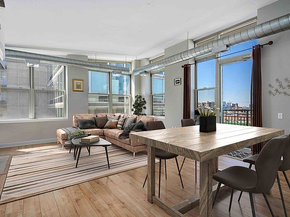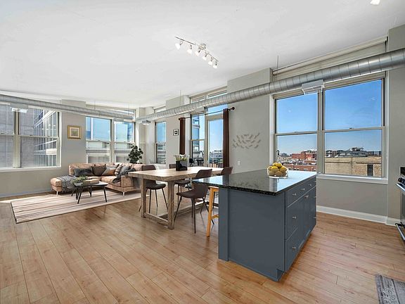 This penthouse level oversized corner West Loop loft with large balcony surpasses all the rest! Move right in and start enjoying the West Loop lifestyle close to Mary Bartelme Park and Randolph St restaurants! Sellers invested $25K in extensive upgrades including new flooring in the living/dining area and hallway, newer furnace and A/C, fresh paint throughout the home, refinished kitchen and bathroom cabinetry and Nest Thermostat. Natural light pours in through large windows and doors leading out to the large west-facing balcony for you to enjoy sunset views. Find plenty of space in the oversized living area with space for a large sectional and dining area, plus a gas fireplace with stone surround. High lofted ceilings give this already spacious home a great feeling of open airiness. Natural light continues into the open eat-in kitchen, offering island seating for 2, plentiful cabinet storage, stainless steel appliances and decorative backsplash. Two other special bonuses of this loft include the split floor plan, and fully enclosed bedrooms with full to-the-ceiling walls. A king bed and night stands are comfortably accommodated by the primary suite, which also boasts a huge walk-in closet with built-ins. Residents enjoy amenities including a sundeck, gym, on-site management and extra storage. Unbeatable West Loop location close to Soho House, Whole Foods/Mariano's, easy access to I-90 and public transportation. 1 attached garage parking space available for an additional $35K.