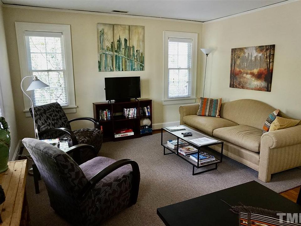Wonderfully located duplex apartment in Cameron Park. Walk to Cameron Village & Glenwood South in minutes. Take your constitutional walk thru the tree lined streets of Cameron Park & then relax on the home's side patio. With 2 bedrooms & 1 full bath this apt works well for a couple with a guest bedroom or a roommate situation. Apartment is fully furnished but furniture can be removed if tenant desires. Flexible lease term with anywhere from 6-12 months. Water, Sewer, Trash & Internet included in rent.