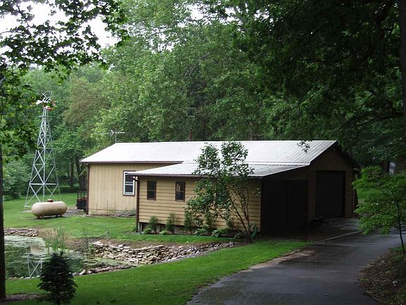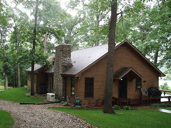 Cozy lakefront cabin on approx. 10 wooded and rolling acres. Enjoy your privacy in this rustic home at the edge of Forest Lakes subdivision. Hardwood floors in great room/kitchen/dining open concept home. Cherry kitchen cabinetry with newer stainless steel appliances. Beautiful fieldstone woodburning fireplace in great room. Master suite addition with cathedral ceiling in 2012 w/large walk-in tile shower, double lavs in granite, walk-in closet and gas fireplace. Furnace, water heater, a/c new in 2012. 2 car heated garage 20' X 27'. Heated barn/shop is approx. 1900 sq. ft. Beautifully landscaped home with terracing and large boulders. New full house generator and over 1000' blacktop driveway.