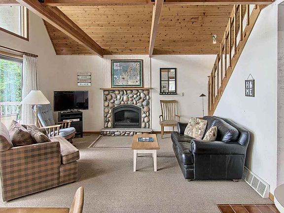 WHAT A WONDERFUL LOCATION! Enjoy your three bedroom, 2 bath, chalet style cottage on 100 feet of fabulous sandy Torch Lake frontage. You will love that it is walking distance to the quaint town of Alden for dinner, shopping or treat yourself to an ice cream cone. The great room has beamed ceilings and a stone fireplace, a cozy spot to snuggle up and read a book. The kitchen is open with a decorative tile backsplash and has plenty of bar seating. The upper level has a loft with a bedroom and bath. The finished lower level has a family room and extra sleeping area, along with abundant storage. A brick walkway leads to the two car garage, plenty of room for all your water toys. Come evening, relax on your deck overlooking beautiful Torch Lake and enjoy the amazing sunsets, then toast marshmallows in your lakeside fire-pit! Call today to schedule a time to see this desirable up north property.