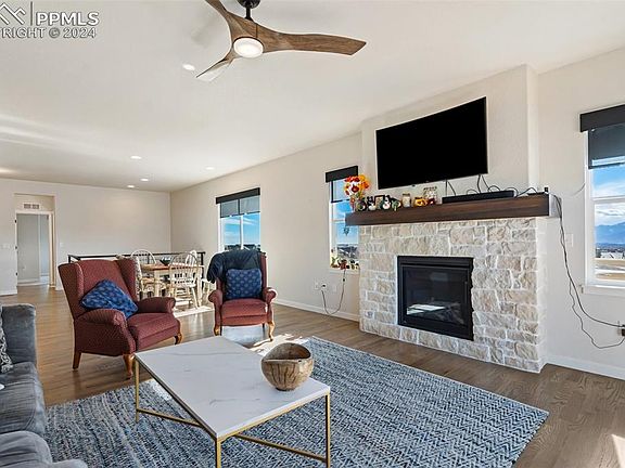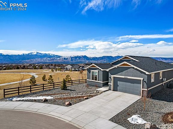 Come home to what could easily be the nicest lot in Cordera! This beautiful Vantage home is better than new with numerous tasteful as well as functional upgrades. This home features true main level living with everything you need plus a guest bedroom all on the main floor. The basement adds 2 more large bedrooms as well as plentiful storage and a flex space that could become an office or a gym! The home sits right next to a park at the end of a cul de sac with unobstructed, and never to be obstructed views of Pikes Peak and the front range. The grading of the lot allows for Pikes Peak views even from the basement windows. A large west facing deck invites you to spend your summer nights watching the sunsets above the Rampart Range. Solar panel system is included in the sale that is engineered to provide over 10,000 KwH of electricity annually. This coupled with a professionally installed 220v outlet in garage makes this home super EV friendly. CAT 6 cable throughout the home to take your online capabilities way deeper into the 21st century than most of the neighbors. This home looks like a model, sits on an amazing quarter acre lot and comes complete with over 50k in landscaping included. HOA dues included trash removal and access to the community center. This home isn't brand new, its better!