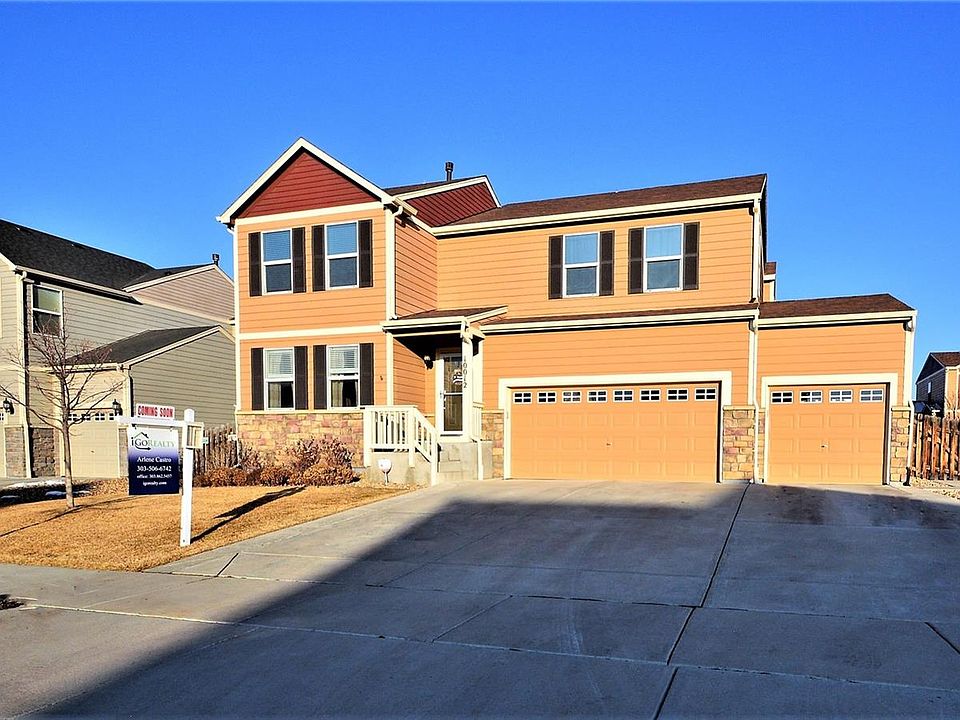 Fantastic Family home located in Harvest Meadows. This warm and inviting home features: 3 bedrooms, 3 bathrooms with a 3 car attached garage. On the main level, there is a living room, family room with a gas fireplace, oversized kitchen with granite countertops, wood floors and breakfast nook. Upstairs includes a loft area with built-in desks and cabinets, walk-in laundry room, two good size bedrooms, and a full bathroom. The expansive master suite features a vaulted ceiling, a sitting area, 5 piece bathroom, and large closet. Never run out of hot water with the newly installed 96-gallon hot water heater. Step out back and enjoy the large backyard with oversized covered patio. NO monthly HOA fees here. Easy access to shopping, DIA, and highway. A great place to call home!