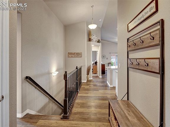 Welcome to this beautiful ranch home with finished basement located in The Vistas at Meridian Ranch! This home comes with a stucco exterior to provide both a beautiful look on the outside and energy savings on the inside. Walking into this warmly lit home enjoy the wood laminate flooring throughout the majority of the main level. Vaulted ceilings makes the living space feel expansive. The open floor plan allows entertaining from the living room, kitchen, and dining area. The kitchen is crafted for a chef with in counter sinks, stone countertops, gas range, and double ovens. Through the laundry room enter the finished two car garage. This home has 5 bedrooms, 3 bathrooms, and TWO of the spare bedrooms on the ground floor! All of the bedrooms are carpeted with expansive closets, but the primary bedroom also features vaulted ceilings. The primary bathroom comes as a 5 piece bathroom with a walk in closet. Taking the stairs down to the basement, the space seems to go on forever! The finished portion of the basement is carpeted throughout and provides space for any entertaining activity. Two additional bedrooms share a three piece bathroom on the basement level and give a sense of privacy for any guests that may visit. Moving back upstairs, the living room features a walk out to a concrete patio covered with a custom pergola fully equipped with shades to provide privacy and respite from the late afternoon sun. The automatic sprinkler system keeps the grass green and promotes outdoor living. The 8x8 hot tub is a bonus for the future home owner! The outdoors will be easy to maintain with the gardening tools stored in the storage shed and bin. This home is minutes walk from Falcon High School and minutes drive to all the shopping necessities anyone could ask for. Photos do not do this home justice. Come and see it in person and fall in love with your new home!