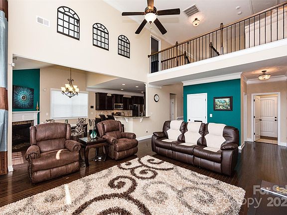 Minutes to Charlotte Douglas International Airport, downtown Charlotte, I-85, and I-485. The grand foyer leads to a beautiful vaulted dining room, with room to entertain. Stunning two-story great room, w/curved wall of windows, opens to the gourmet kitchen showcasing granite countertops & stainless-steel appliances. Spacious first floor master suite W/trey ceiling features a sitting room & attractive master bath with walk-in closet. Overlooking the great room, the loft is a terrific space to unwind and enjoy the scenic view of the outdoors. 3 additional bedrooms on the second floor, including a second suite with private full bath. The large, unfinished basement is plumbed and ready for you to customize. Irrigated backyard, surrounded by trees, provides a totally private retreat. This sought-after waterfront community, has resort-style amenities W/two pools, clubhouse, tennis/pickleball courts, walking trails, and lake access for your boat or kayak. HOA includes cable/internet/garbage.