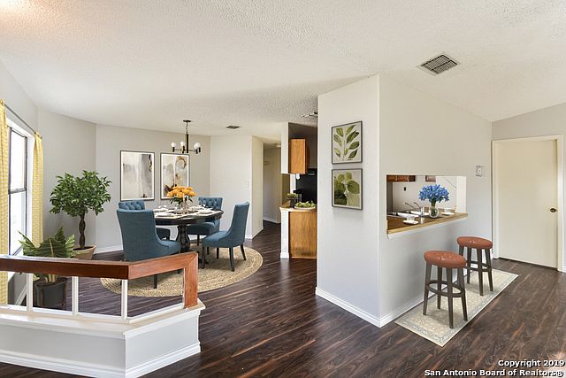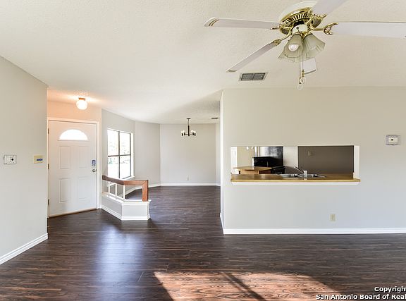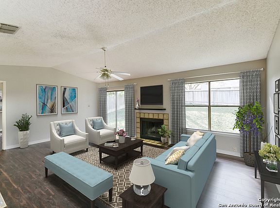 This Converse home offers a fireplace, a patio, and a two-car garage.
