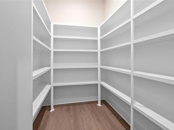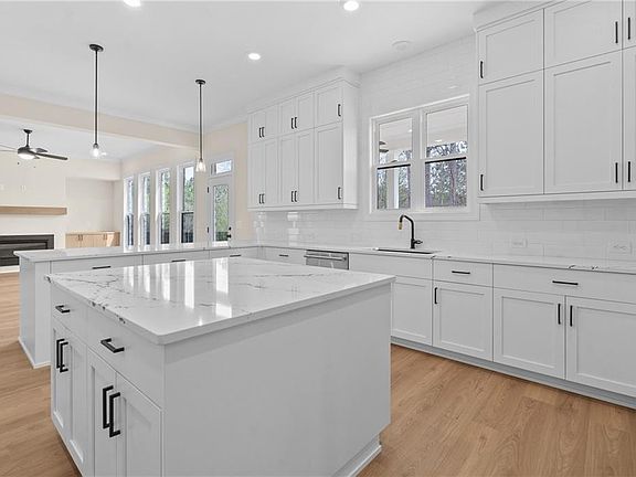 - Features: Breakfast Bar, Cabinets Stain, Cabinets White, Kitchen Island, Pantry Walk-In, Stone Counters, View to Family Room
