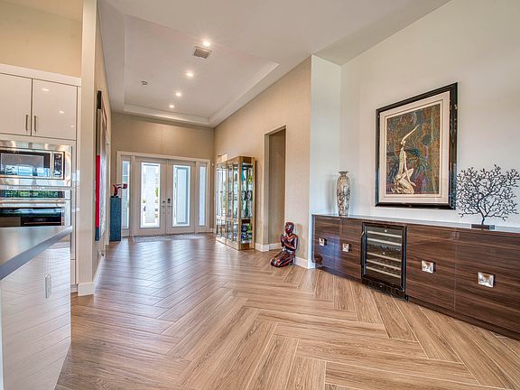 The primary suite is a luxurious retreat, with soaring architectural ceilings, neutral-toned carpeting, and space for a cozy seating area. Two generous walk-in closets and an upscale en-suite bathroom complete the suite, the latter blending classic and contemporary styles with dramatic dark wallpaper and marble-look tile. Dual sinks, a glass-enclosed shower with a seating bench, and a separate soaking tub create a space of both elegance and indulgent comfort. Step outside to the covered patio, surrounded by lush tropical landscaping and a fenced yard, offering an inviting space for outdoor relaxation and entertaining. All closets, including the laundry room, are built out with custom systems, while the garage features custom storage and epoxy flooring, combining function with style. This home is a seamless combination of refined design, modern amenities, and effortless indoor-outdoor living, offering a lifestyle of comfort, elegance, and sophistication in one of Palm Beach Gardens' most sought-after communities.