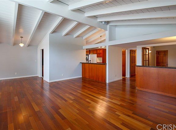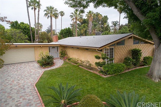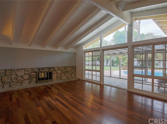 Beautifully Remodeled, Mid- Century Modern Ranch Home In Northridge, Features 4 bedrooms, 2 Baths, and includes over 2000 Sq. Ft. of Living Space. This home has an open concept design with high pitched beam ceilings throughout. Large living room, media area, with rock fireplace. Step down den with additional fireplace. Eat in galley kitchen with many updates. Master bedroom includes two closets and a beautifully remodeled bathroom which includes double sinks and new shower. This home has been decorated with designer paint and a neutral palette. Cherry Wood floors and travertine tile give this home an inviting feel. Central air and heat, upgraded insulation are also included. Fourth bedroom can be used as home office or guest bedroom room with open glass doors. Screened in patio area is great for outdoor play and a beautiful pool accompanies this yard for entertaining. Also included are fruit trees and a large lot. This home is in the award winning, Elite Granada Hills School District. This school has ranked very high and won many awards. Come See this Beauty, Centrally located to Freeways, Shopping and more!!