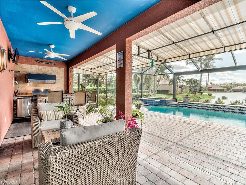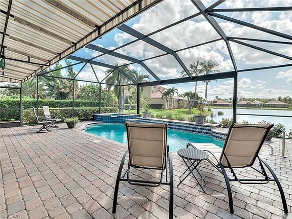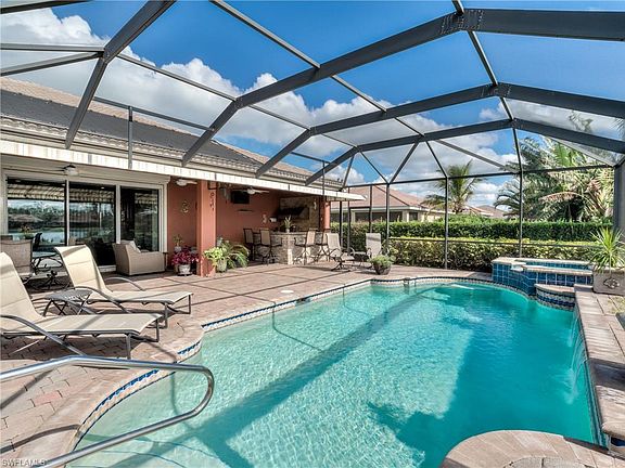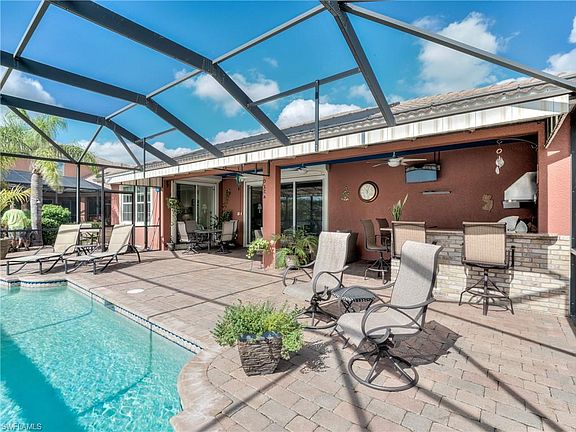 Beautiful, highly upgraded, lakefront, 3 bedrooms+den, 2 bath home in The Promenade East in the Forum now for sale! Outdoor paradise included! Swim year round in this gorgeous, solar heated pool with water features, spa & picture window overlooking a sparkling lake! Cozy up on cool nights to the custom built outdoor fireplace. Entertain & cook for your friends & family at your custom outdoor kitchen. Large great room floor plan with stunning view. Kitchen includes granite countertops, stainless steel appliances & 42 inch upper cabinets. Spacious master bedroom has a spectacular lake view & his & her built-in closets. Master bathroom includes a separate stand up shower & tub, dual vanities & a water closet. Plantation shutters & crown molding throughout. Hurricane screens for front door & back lanai. New AC with UV light 11/8/21. Garage with tool bench & storage for tools & epoxied floors. Culligan water system included. A quick drive to Historic Downtown Fort Myers, Edison/Ford Winter Estates, local colleges & schools, hospitals, parks, fantastic dining & shopping, Fort Myers Beach & the beautiful islands of Sanibel and Captiva! *New park being built next to the community.*
