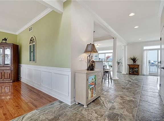 An impressive home in Riviera section awaits it's new owners! A sprawling 2700 SF on a 75x100 lot w/breathtaking views of the lagoon that are guaranteed to please! A maintenance free front yard guides you to the main entry of the home where you're welcomed to a 2 story foyer & an interior designed to perfection! Gorgeous formal DR features sophisticated wainscoting moldings, glistening hard wood floors, & a custom chandelier medallion. The detail throughout cannot be overlooked! From room to room, extraordinary designs & custom work! Chefs kitchen is fit for all! An abundance of maple cabinets, SS appliances, wine refrigerator, granite counters, separate ding area & sliding doors leading to a composite rear deck! As the kitchen opens to the LR, the main level was made for entertaining! Overlook the huge yard, 75' dock, paver patio, all from your Master BR balcony! 3 more sizable BRs accompany a laundry closet to complete the home. You won't want to miss out on this home!