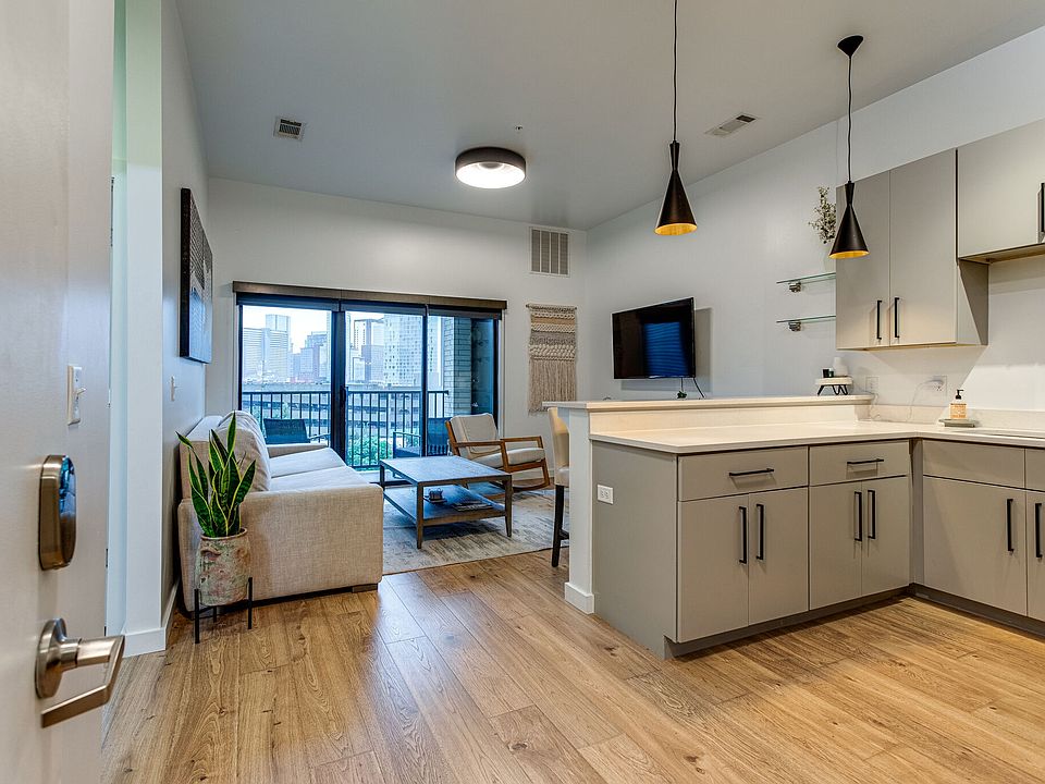 Experience luxury living in one of Nashville’s most vibrant neighborhoods! This beautifully updated 1-bedroom condo is located in the heart of The Gulch—just steps from popular dining spots like The Iberian Pig, STK Steakhouse, and Superica. Even more convenience is coming soon with a new 5 Points Pizza, Starbucks, and rooftop Cantina Bar right across the street. Situated on the quiet rear side of the building, this 4th-floor unit offers peaceful downtown views from a private balcony. Inside, you’ll find soaring 10-foot ceilings, a spacious layout, and over $10,000 in recent upgrades—including fresh paint, a brand-new water heater, custom glass shower doors, and a key-less entry system. The sleek kitchen features quartz countertops, ample prep space, and a large breakfast bar that comfortably seats four. Residents enjoy access to top-tier amenities including an expansive terrace and resident lounge and a secure owner-only garage with parking elevator. There is a fully equipped fitness room and secure bike storage with repair station available. Included in the HOA package is high speed unlimited Google Fiber for all your personal and business activities. Long-term rental is available with a waiting list to do so. Don’t miss this opportunity to own a stylish, move-in ready condo in one of Nashville’s hottest neighborhoods!