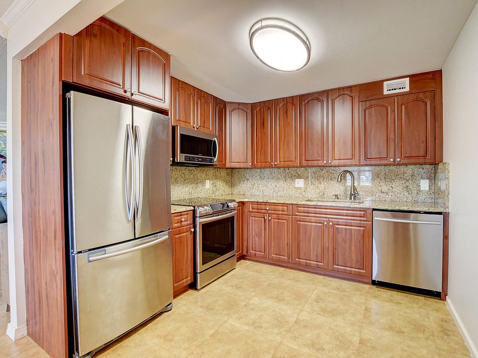 Beautifully remodeled first floor apartment just steps from the catwalk. Custom wood kitchen with wood cabinets, granite countertops, and stainless steel appliances. Both bathrooms are also remodeled with tile up to the ceilings and new vanities. Additional upgrades include crown molding, plantation shutters, tiled throughout, and jalousie enclosed patio. Gorgeous lake view from the patio. Motivated Seller.