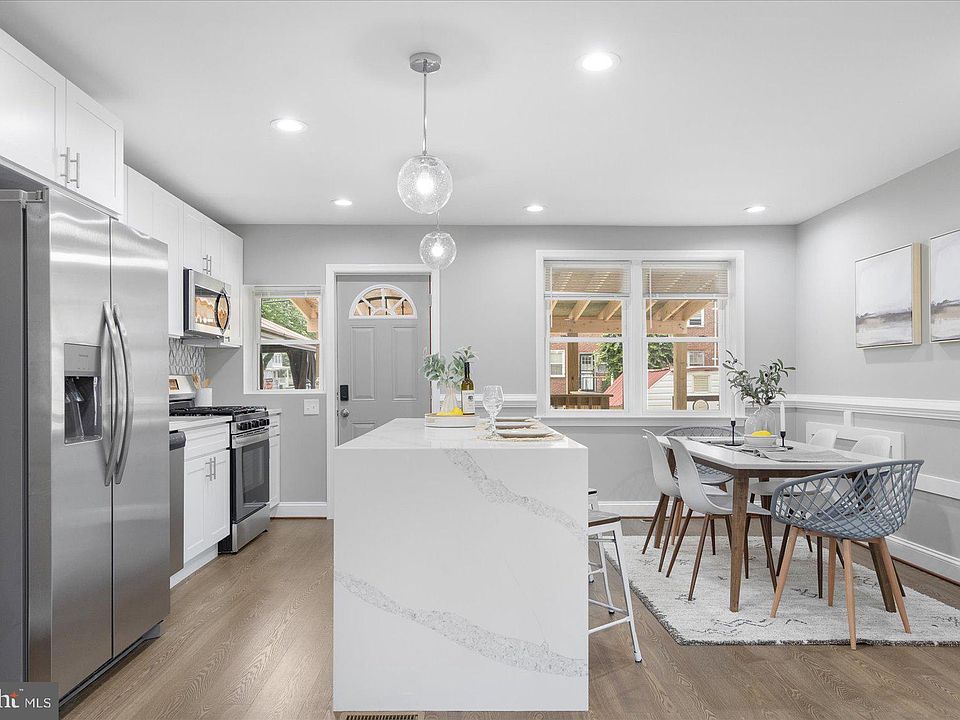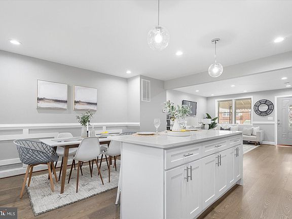 Beautifully remodeled 4BR/2BA brick Townhome on a quiet street. The steps to the front door of your forever home are built with custom inlay tiles that lead to the covered front porch with a beadboard ceiling. The stunning open concept main floor boasts tons of natural light, recessed lighting, easy care flooring, wainscoting on the walls in the large living room and dinning room. The open flow allows for ease when entertaining family and friends. The spectacular kitchen offers plenty of cabinets, stainless steel appliances, quartz countertops with a complementing backsplash, and a deep stainless sink set into an island with a waterfall edge, pendant lighting, and breakfast seating for four. Just off the kitchen is an enclosed porch which leads to the fenced yard. with parking pad. The newly carpeted second floor hosts a large primary bedroom, two sizable secondary bedrooms, and a beautifully tiled full bath. The lower level offers additional living space featuring the fourth bedroom, a full bath with walk-in shower, laundry, storage space, and a walk-out to the enclosed porch. This home features a fenced yard. This home is move-in ready with so much to offer new homeowners and is located in close proximity to shopping, restaurants, and commuter routes.