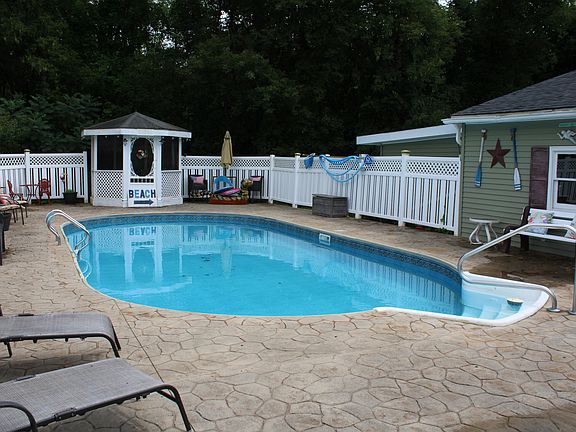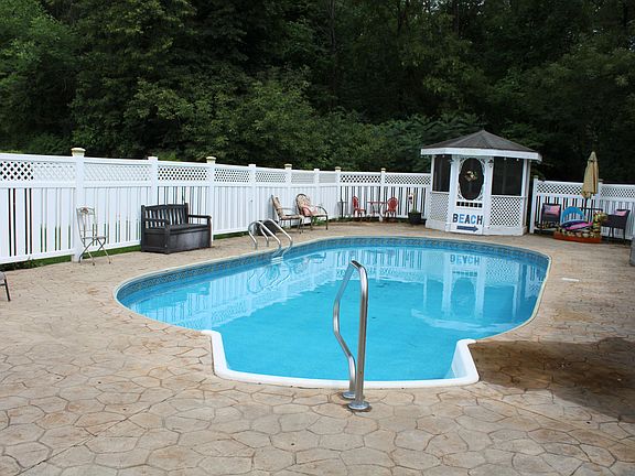 Older home, well maintained. 3 bedrooms, 2 baths. Charming Great Room with bar, attached to hot tub room. Hot tub will remain. Slider door directly to pool. Private back yard with inground pool, one depth of approximately 5 feet. Fenced with white vinyl fencing. Propane fireplace in living room. Workshop in oversized garage. Stainless steel appliances, paved driveway with plenty of extra parking. Brand new propane furnace.