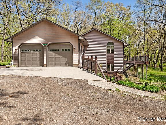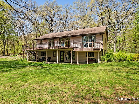 Surrounded by nature and nestled on 3.9 private acres that backs up to State owned land. This peaceful, park-like setting is filled with trees, songbirds and wildlife. Featuring an open floor plan with cathedral ceilings and a wall of sliders to a spacious deck. This home is filled with light, and nature is always just a few steps away. The private main floor owner's suite offers 2 generous closets, sliders to the deck, a master bath with custom cabinets, and tiled shower with double shower heads. In addition, there is a main floor laundry area and second main floor full bath. The third full bath is located at the walkout level. Three additional bedrooms, an office and family room are also located at the walkout level. Do you need shop space? The 24'x38' pole barn should more than meet the needs of any woodworker, car collector or other serious hobbyist. It features two overhead doors, an insulated and heated work room, floor drain, and storage loft. You'll love it for hobbies or just plain storage. This home and property are well cared for and up to date. You won't want to miss it. Call today to schedule a tour. You'll be glad you did!
