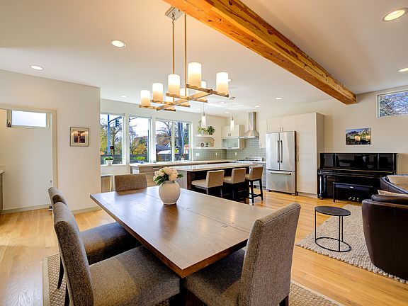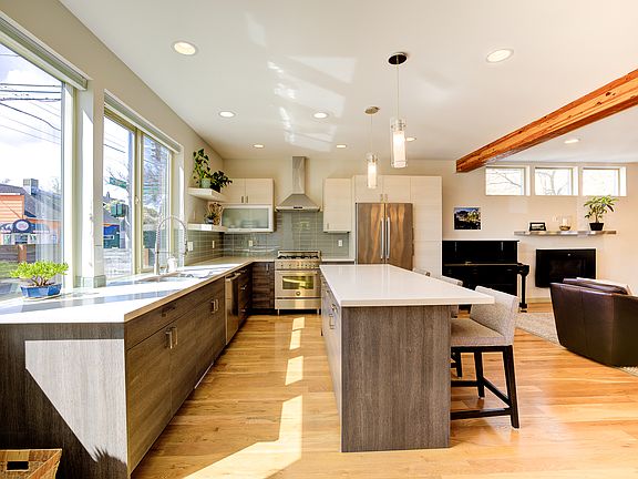 Maple Leaf Modern. Convenient location with easy access to light rail, shopping, restaurants, parks, and commuting. This large 4 bedroom home is the perfect layout with 4 bedrooms up and plenty of room for everyone. The main level is a great room open concept, perfect for connected living and takes full advantage of southern exposure and light. Beautiful finish in place white oak floors, wonderful modern kitchen with island, gas fireplace, and patio just off the living area, perfect for weekend bbq's. The surprise to this home is the amazing top floor bonus room/media room/bar and full bath plus outdoor deck. This area can be used many different ways. Even consider an MIL. Large outdoor deck is an amazing space with territorial/city views.