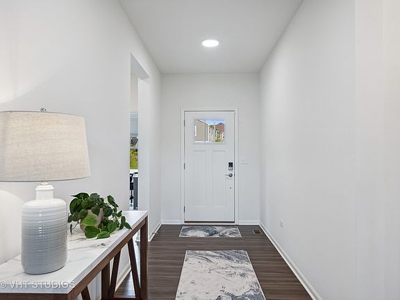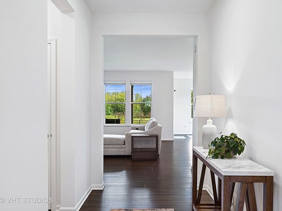 This stunning Adams model home is now available without the wait for new construction. Situated on a serene pond, the property offers picturesque views that add to its charm. The home features a large, open gourmet island kitchen with quartz countertops, 42" upgraded white cabinets, a walk-in pantry, and stainless-steel appliances. The breakfast room, overlooking a covered patio, is perfect for morning coffee or evening relaxation. The family room boasts a custom gas fireplace, creating a cozy and inviting atmosphere. The primary suite includes an oversized luxury bath with a 35" upgraded white vanity with quartz countertops and a spacious walk-in closet with custom shelving. Bedrooms 2 and 3 each have walk-in closets and share a full bath. A convenient first-floor laundry adds to the home's functionality, along with a key drop area featuring white cabinets and quartz countertops for extra storage. Luxury vinyl plank flooring is featured in the foyer, kitchen, powder room, all bathrooms, and the laundry room. This smart home comes equipped with a Ring alarm security kit, Ring doorbell, smart thermostat, and Schlage Wi-Fi smart lock. Additional features include a full basement, a 3-car garage with openers and keypads for all doors, and a professionally landscaped yard with a 5-ft black aluminum fence. The community is conveniently located within two miles of shopping, dining, and healthcare facilities, and is less than four miles from Three Oaks Recreation Center and Lake Park/Main Beach. The nearby Crystal Lake Metra station allows for a traffic-free commute to larger surrounding areas and the City of Chicago. There is also convenient access to major transportation corridors such as Route 14, 31, 176, and I-90. Crystal Lake boasts a historic downtown, beaches for summer swimming, and parks for walks and family gatherings. Top-rated schools add to the appeal. With its beautiful location and outstanding amenities, this home is the perfect choice for your next move.