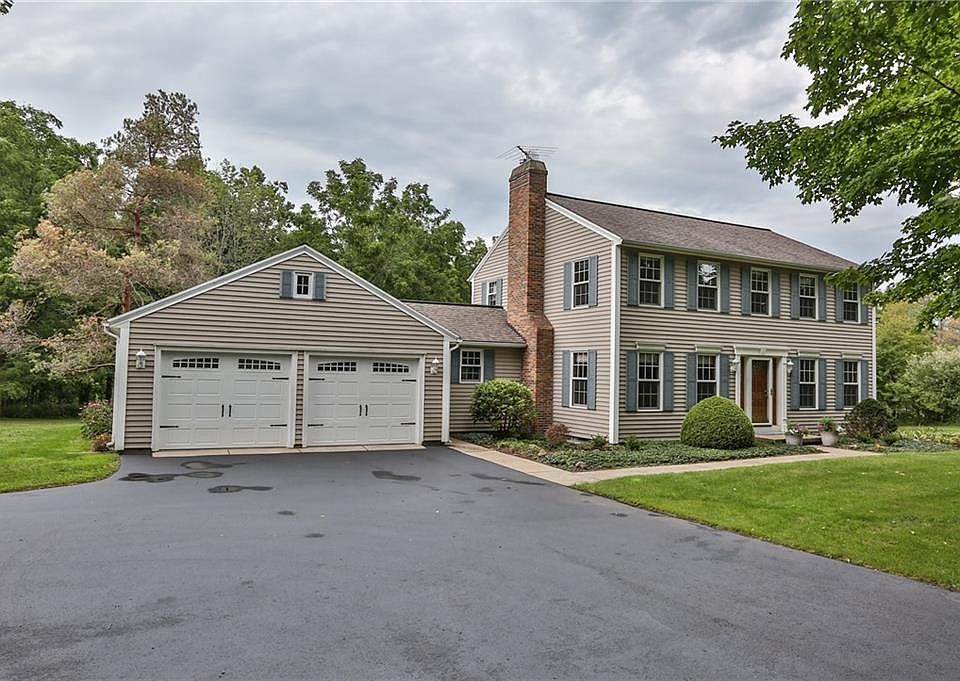 Nature-lover's dream! Almost 4 acres w/Oatka Creek frontage & nature trails! This meticulously maintained & updated Sickles-built home features 3 beds, 3 full baths, & 2128 sqft + finished walkout basement. Open living/dining room w/natural wood beams, electric fireplace, & doors to rear deck. Gourmet quartz kitchen w/center island, neutral tile backsplash, stainless appliances, pantry, & breakfast area. 1st floor laundry/mud room area w/extra closet & cabinet space. Rear & garage entry. Spacious, full 1st floor bathroom. Den w/wood-burning fireplace completes 1st floor. 2nd floor includes 2 generous guest rooms, sleek main bath, & luxurious master suite w/stunning attached bath. Partially finished lower level w/ rec room and storage. Walks out to private, partially fenced yard. Must-see!