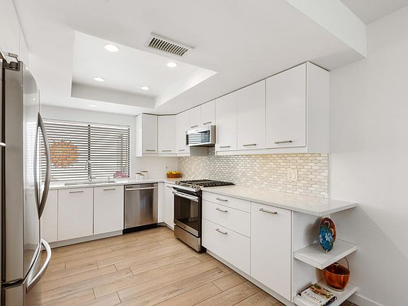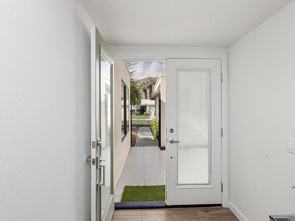 WOW! this one checks all the boxes! Beautifully updated in a classic modern design with high VAULTED CEILINGS and NO POPCORN... located in the very desirable Sunrise Villas on a quiet cul-de-sac and with a back veranda on a greenbelt with fruit trees. SINGLE LEVEL with a 1-car GARAGE... and on FEE LAND (you own!). Enter through the gated front courtyards with views of the magnificent San Jacinto mountains and with a retractable awning where you can BBQ and enjoy your evening cocktail. Step into the gorgeous living space with porcelain floor tile and OPEN FLOORPLAN. Entertainer's kitchen has been reconfigured to have lots of storage space and views of the mountains. Open to the living and dining areas, the kitchen features stainless steel appliances, quartz countertops and custom backsplash. Spacious Primary Bedroom opens to the Veranda and has an ensuite bath with double vanity, huge shower and custom walk-in closet. Great separation of bedrooms as the Guest Room is on the other side of the home with access to its own bath.Washer/Dryer are located in a room off the front courtyard and the garage has ample storage. The community offers 8 pools, 3 spas, tennis courts and PICKLEBALL courts...and the HOA includes cable and internet. Great location to walk or bike to downtown Palm Springs... close to Golf Courses, Jensens, Ralphs, Starbucks and other retail, restaurants and services. This is truly RESORT LIVING and makes a great vacation getaway or full time residence. Must see!