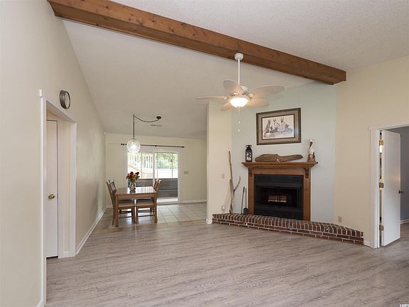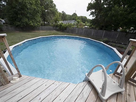 Welcome Home! Cozy 3 br, 2ba ranch with a sparkling above-ground pool for those hot summer days. Located in Bridge Creek, Socastee, this house has never flooded and has an attached 1-car garage. No HOA and one of the largest yards in the neighborhood are only two of many great features at this convenient location. As you step inside, the living room offers a wood-burning fireplace, vaulted ceiling, and eat-in dining area with vinyl flooring throughout. The galley kitchen was recently renovated with white cabinets and stainless appliances. Fresh interior paint and trim in all the bedrooms offer a move-in ready house. The master bedroom color is 'Blissful Blue' and a new barn door on the bathroom adds convenience. Choose to sit on the covered front porch, or enjoy the screened back porch which overlooks the fenced-in yard with additional pavers in your BBQ area and a vegetable garden. Barely 15 minutes from the ocean (Springmaid Pier for fishing, for example) and very accessible to Myrtle Beach Intl Airport as well as the Market Common, and all that the Grand Strand has to offer. All measurements are approximate and should be verified by the buyer.