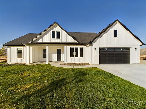 Discover this stunning home, built in fall 2023 on 5 private, irrigated acres with a seasonal creek. Large windows frame sweeping views of Montour Valley, Squaw Butte, and Regan Butte. The spacious living room has vaulted ceilings and a stone-surround wood-burning fireplace, while the open kitchen features quartz countertops and upgraded stainless-steel appliances. Step out onto the covered patio to enjoy deer and other wildlife on the property. With 3 bedrooms, an office wired for Starlink, and R-50 ceiling insulation, this home is comfortable and efficient. The entire property is fully fenced for animals, with round pole fencing and sprinklers around the landscaped yard. Enjoy nearby Montour Wildlife Management Area for bird hunting and trails.The master suite includes an extra-large walk-in closet, a soaker tub, and a walk-in shower.