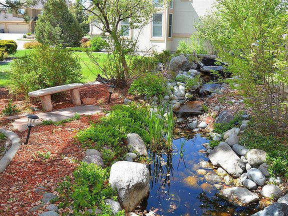 Spectacular home!! Waterfall feature that can be seen and heard from the covered front porch. Situated in a friendly community in a cul-de-sac, with an award-winning school system, just minutes from I-25, Powers, shopping & dining. Open floor plan! Gleaming wood floor entry. Beautiful Eat-in kitchen with gorgeous wood floors, ample cabinetry, gas range top, breakfast bar, 2 pantries & recessed lighting. Walk out from the large living room with gas/log fireplace to an oversized red wood deck providing amazing mountain views & wonderful views of the Air Force Academy. Serene family room with substantial natural light, gas/log fireplace, & vaulted ceiling. French doors that lead into a large bedroom with elegant wood floors. ½ bath & Laundry room with cabinets and window complete the main level. Wide staircase to upper level. Loft area that overlooks to the main level. Spacious master bedroom with sitting area, walk-in closet & attached 5-piece bathroom with dual sinks, stand alone