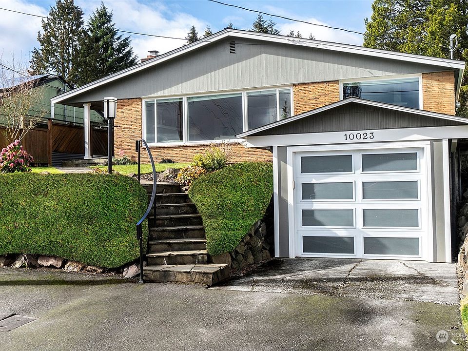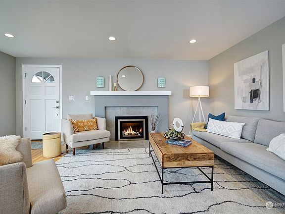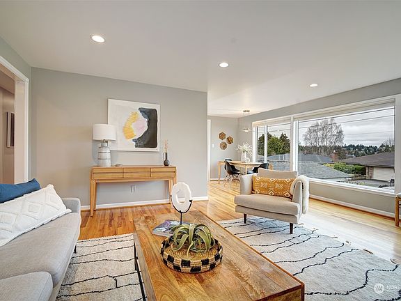 Perched above the street with large picture windows showcasing the territorial and Cascade Mountain views. Welcome to the light-filled open spaces with oak floors and a gas fireplace anchoring the room. The eat-in kitchen has stainless appliances, ample storage, and a breakfast bar. The dining area next to the kitchen provides the perfect place for easy entertaining. Away from the social spaces are 2 large bedrooms, 1 ½ baths, and an office. Head out to the backyard to relax or play with a deck and hot tub, a large entertainment patio, a tiered yard with garden beds, and a perfect turf for summer fun - cornhole games and BBQs! Minutes away is Carkeek Park, with trails through 220 acres of forest, meadows, wetlands, creeks, and beach.