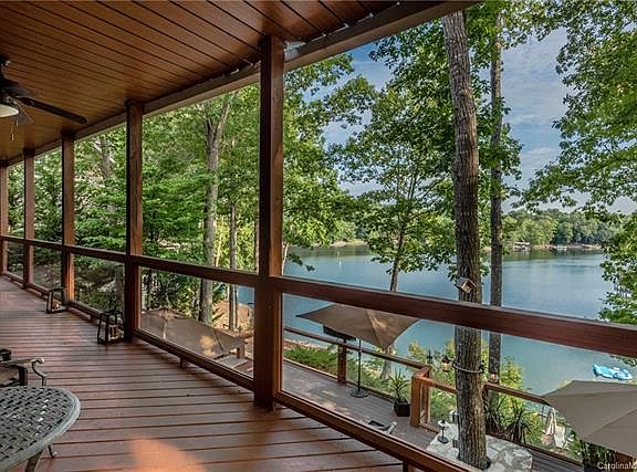 WATERFRONT on Lake Wylie in Tega Cay, SC. Views of Windjammer Cove from almost every room! Stunning hardwood floors throughout this custom remodel in 2008. Amazing outdoor living! Stone patio with built in stone seating & fire pit, covered outdoor game area, deck, patio with 2nd fire pit, covered deck off the great room with ceiling fans & lake views, tiki bar by the dock. Surround sound through out & by the lake! Sound system in the office closet will convey; system integrated with wall switches. Gourmet kitchen, stainless appliances, granite, gas professional cooktop, island bar seats 5, wine fridge. Open floorpan to great room, double sided gas fireplace. Five Bedrooms, Bedroom 4 has it's own private bath. Master steam shower. Lower level family room with tile floor & wet bar. Heated & cooled outdoor full bath for coming in off the lake, misting stations. Covered dock, boat lift, wooded area, storage. Central vac, Rinnai tankless hot water. Fort Mill School District.