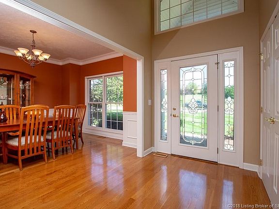 BEAUTIFUL TRADITIONAL BRICK HOME. This home offers over 4,400 SQ FT which includes a large eat in kitchen with hardwood floors, center island and all appliances, beautiful cabinets. Formal dining room with hardwood floors. 2 Story entryway. 2 Story great room with gas fireplace and balcony overlooking family room. 1st floor large master bedroom with sitting area. Master Bath with whirlpool tub and walk in shower plus walk in closet. His and her vanities. Half bath on 1st floor. Second bedroom with vaulted ceiling on first floor also 3 bedrooms upstairs with two full baths. Great sitting area overlooking 1st floor family room. Lower level offers a theater room with all equipment and stadium chairs remaining. Family room with double doors leading to patio area and office area. 1st floor laundry room. New 50 yr roof with transferable warranty installed 8/2018. Large unfinished area possible additional bedroom area. Two furnace units in the home. You can sit out on your deck and enjoy the sunsets. large 3.5 side load garage. Club house and pool is next door with basketball court and tennis courts. Only 20 minutes to Louisville. Beautifully landscaped.