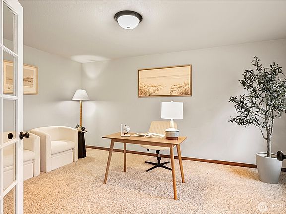 Welcome to the beautiful gated community of Greenfield Park! This fully detached corner lot home boasts 3bdr + a large flex room + 2.5bath & a spacious 2-car garage. Entry level flex room is idea for office or guest bdr. Main living area features wood-wrapped windows with upgraded blinds, new vinyl floor, cozy gas FP and a versatile area for extra office space. Kitchen w/breakfast bar, sophisticated dining rm w/a bay window. Primary master suite w/a vaulted ceiling, 5 piece bath & a WIC. Enjoy grilling under a covered balcony. Well-maintained community offers a playground, soccer field, dog run, car wash area, & ample guest parking. Low HOA dues cover water, sewer, lawn service, & common area. Close to shops + trails+ I5-a commuter’s dream.