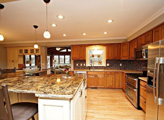 Remodeled open floor plan, 4BR, 2BA home w/numerous upgrades. Cntr island w/granite, storage & seating. SS appliances, hdwd floors, custom buffet counter, 4 season porch. New frnt door w/side glass. Newer triple pain windows, roof, furnace & A/C.