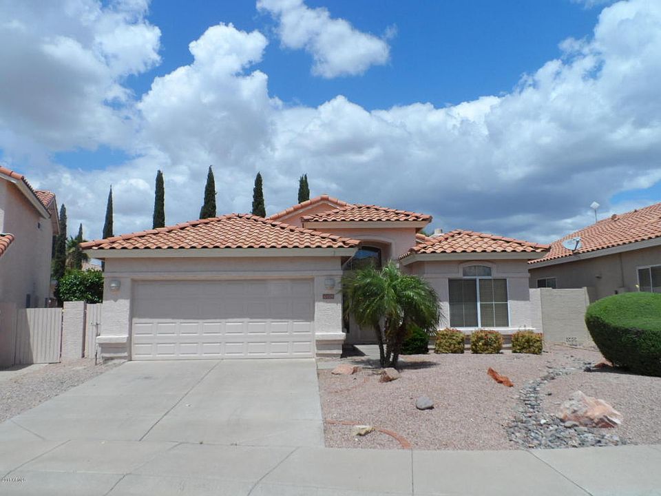 PRICE REDUCED AGAIN!! Great neighborhood. Cul-de-sac lot, fully desert landscaped, N/S exposure. Gorgeous kitchen with newly finished travertine tile, granite counter tops, pull out shelving in all cabinets, new faucet and stainless steel sink, drop down TV and two ceiling fans. Great room with cathedral ceiling, fully wired for surround sound, fire place and freshly cleaned carpeting. Cathedral ceilings t/o the house. Large master bedroom with walk in closet. Travertine tile in hallway bath and laundry room. Laminated floors in hallway and small bedrooms. Extras include secure, electric dog door, water softener, newer a/c, full house air filter and new, smooth top stove effective Nov, 2015, and ceiling fans in every room, including master bath. Close to shopping, freeway and dog park.