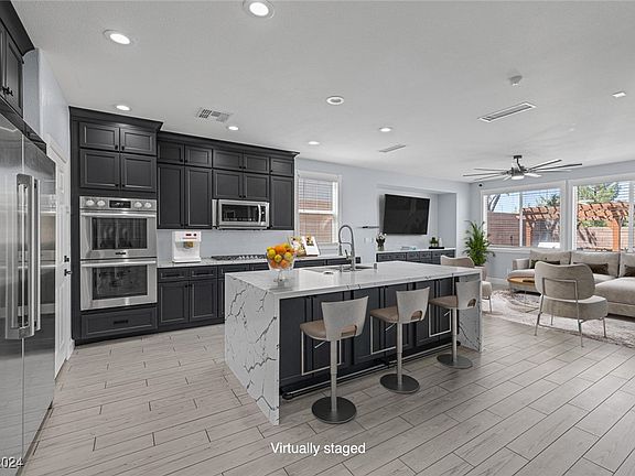 A fully remodeled CUSTOM 5-BEDROOM, 4-BATHROOM home in the coveted TURTLE ROCK neighborhood of CENTENNIAL HILLS. NO REAR NEIGHBORS! Boasting over $150K in INTERIOR IMPROVEMENTS, this home is DECKED OUT! It features CUSTOM J&K CABINETRY, CALACATTA LAZA QUARTZ with a waterfall edge, ELECTROLUX refrigerator, DOUBLE OVENS & VEGAS MODERN STYLE FINISHES. Custom front DEN and FORMAL DINING with wet bar & mini fridge! The primary suite impresses with a CUSTOM ACCENT WALL, while the spacious loft offers stunning VIEWS of the SHEEP MOUNTAINS & GILCREASE BROTHERS PARK. Enjoy a FRONT DEN, FORMAL DINING AREA, SUN ROOM & a CUSTOM WET BAR. Relax in the MODERN POOL & SPA (built 2019), entertain in the OUTDOOR KITCHEN w/ a COVERED PERGOLA & AMBIANCE LIGHTING, & enjoy the ultimate GARAGE GYM w/ mini split. Additional features include 100% PAID-OFF TESLA SOLAR PANELS, SMART HOME features, CUSTOM CLOSETS, an epoxied GARAGE w/ custom storage, WATER SOFTENER & RO SYSTEM. BETTER THAN NEW!