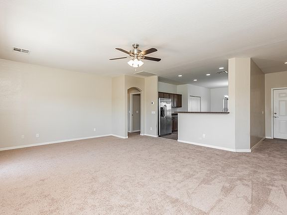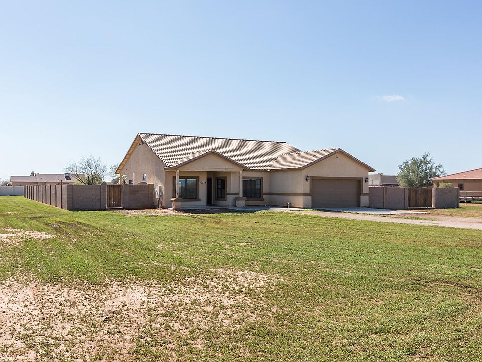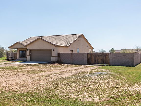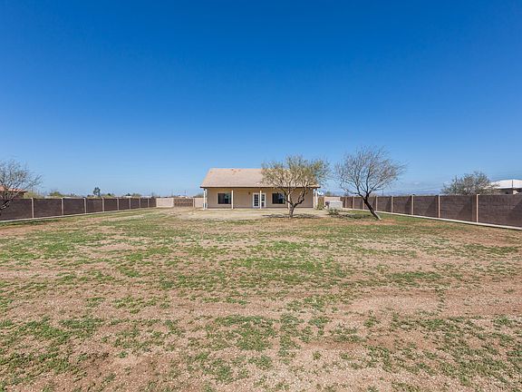 Sitting on 1.25 acres with NO HOA, this home offers 3 bedrooms & 2 baths in 1585 SqFt with a great room floor plan & split bedrooms. The eat-in kitchen has oak cabinetry, stainless appliances, breakfast bar, recessed lighting & double-door pantry. French doors lead out from the great room to a full-length covered patio, above ground spa, & huge backyard with 7-foot block fencing & cement sidewalk border. Actual property is larger, & there's plenty of room for all your toys and horses! The master bedroom has a private bath with dual sink vanity, separate tub & shower & walk-in closet. Other features: 2 car garage with service door, RV gate, new carpet & interior paint, new water heater, sink & toilets; & much more! Refrigerator, washer, & dryer negotiable. See today!