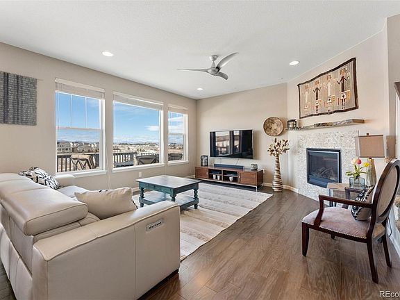 - Description: Dark Wood Floors, Western Views Of The Front Range, Modern Ceiling Fan, Gas Fireplace With Stone Tile Surround And A Live-Edge Sawn Wood Mantel, Large Windows, Window Coverings
