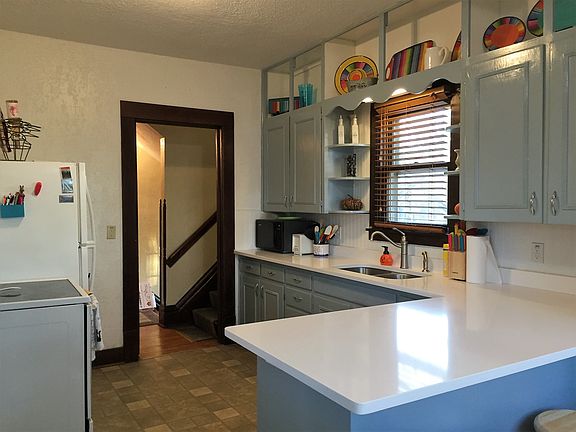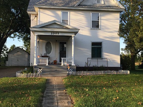 The beautiful farm home is located close to town on a paved road with just under 7 acres. Features include: city water and sewer, natural woodwork, stained glass window, built-in dining room hutch, gorgeous double sided stairway, wood floors and two pocket doors, large front porch, and nice sized deck area. Kitchen has been updated with quartz counter tops. Four good sized bedrooms and a walk-up attic. The property has two outside wells, great for plants, garden or livestock. Outbuildings are an unattached single garage, storage shed, workshop & barn.