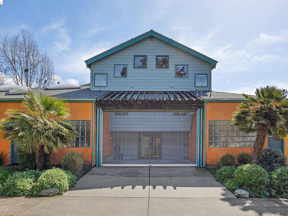 Soaring ceilings, skylights, exposed wood beam rafters, windows that overlook a fountain courtyard, and direct access to garden space–this is a truly special and unique loft property. Designed by noted local architect Thomas Dolan, the newer 1995 construction has an open living/dining area and a modern kitchen with stainless steel appliances, composite quartz countertops, and a breakfast bar. The spacious end unity is spread out over three levels, there are numerous skylights for great natural light, and the two bedrooms are on different levels. Bamboo, reclaimed wood, and cork flooring bring warmth to each space. The upper loft is great for a home office; it is separate from the main living space and surrounded by windows providing great light. Immediately outside the kitchen door is easy access to both a gated and partially covered garage space and a park-like verdant courtyard with outdoor dining table, BBQ, and babbling water foundation. Enjoy the convenience of in-unit laundry. Recent upgrades include a new roof in 2022. Across the street from Temescal Creek Park, this is a great central location close to BART, freeways, and bike routes in vibrant Emeryville known for its shopping, restaurants, and major employers like Pixar.
