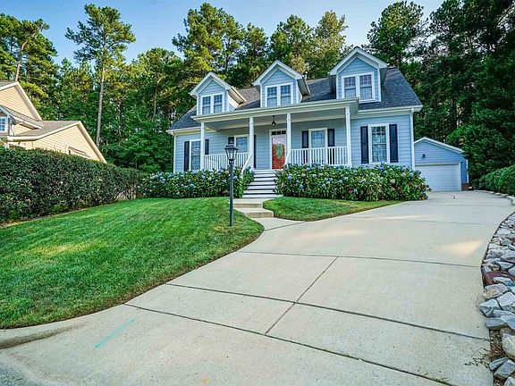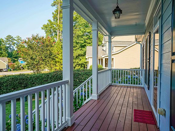 This three bedroom, 2 1/2 bath, low country style home located in Apex, North Carolina is the perfect place to call home. Both the kitchen with dual fuel stove and large walk-in pantry and the living room feature fireplaces and hardwood floors with plenty of natural light. The cozy kitchen and living room feature hardwood floors with plenty of natural light. The primary bedroom has the entire second floor as a suite with it own fireplace. The primary bathroom is large and spa like and the other two bedrooms are located on the first floor. The exterior of the home is made with low country-style details a large front porch, and patio out back. This home offers a peaceful, cozy atmosphere for you and your family to enjoy. With its charming style and location just two doors down from the community pool, this home in Apex, North Carolina is sure to delight.