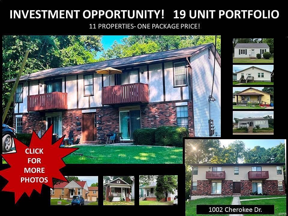 YEARLY GROSS RENTAL INCOME OF $157,920 ! 100% occupied-This seller enjoyed a double digit cap rate! Check out this entire portfolio- includes 19 total units (11 properties), in this sale: Collinsville locations- 1002 Cherokee Dr. (4 unit) 03-04.0-209-005 ; 125 March Dr. 13-2-21-22-17-302-028; Granite City locations- 2637 Grand Ave 22-2-20-18-12-203-041 (2 unit); 2525 Grand Ave 22-2-20-18-15-403-074; 2510 Nameoki Rd. 22-2-20-17-15-403-002 (2 unit); 2316 Edwards St. 22-2-20-18-20-402-018; 2473 Center St. 22-2-20-18-10-102-002; 1105 Veterans Pkwy 22-2-20-18-10-104-007; 2453 Hodges Ave 22-2-20-17-13-305-014; 2747 Washington Ave 22-2-20-17-09-105-020 (possible 2 unit). Click through photos of each of the properties listed above. Don't let this opportunity pass you by- this seller spent 6 years building this portfolio-you can reap the benefits. Call for details - financial information & property updates list is available upon request. Tenants rights apply-do not disturb tenants.