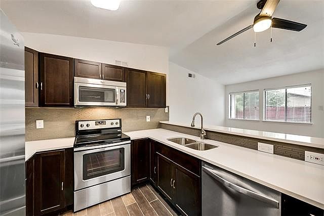 Come and see this updated home in a great location with wonderful schools. Interior offers all new engineered wood floors throughout, with new kitchen cabinets topped with Quartz countertops. SS appliances that include a refrigerator. Glass tile backsplash and tile floor. Both bathrooms have been totally redone. Living room has accented fireplace with decorative mantle. Great space and floorplan. Nice wood fenced back yard. Large 2 car garage.