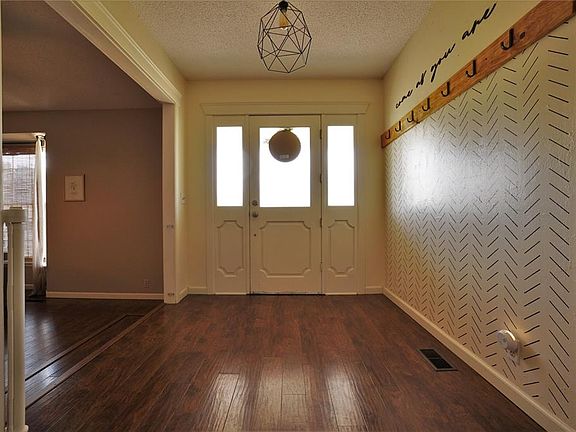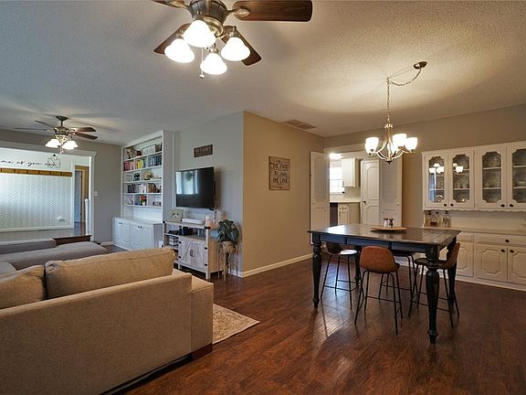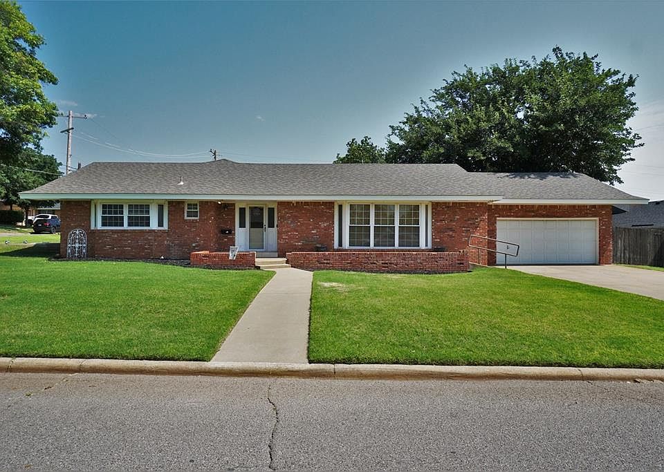 Amazing Home on corner lot located close to East Intermediate School . This Ranch style home is Beautiful starting by opening the Front door. It opens to a large Foyer where you can see all the spacious rooms and the quality of the updates. There are two living areas, one with Wood beams on the ceiling, fireplace, open concept to the spacious kitchen . The kitchen has quartz countertops, Stainless steel appliances, lots of large counter space, storage, laundry area and a small desk area. The front living room has gorgeous lighting and has dinning area attached, The bathrooms are all updated. The primary suite is a very large room, two closets, nice windows for sunshine, a beautiful bath with Walk in shower and double vanity . Let's not forget the large backyard for entertaining with a great deck, play set for the kids and large trees for shade. There is a storm cellar included